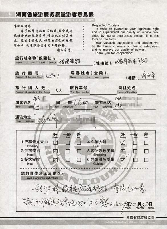 2009年10月17日福州鄒先生一行12人接待質量反饋單: